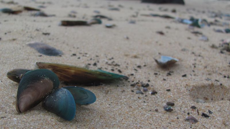 Die Muscheln haben einen Grün-Stich und sehen ein bißchen wie Scherben aus.