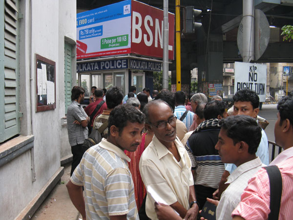 Als wir das Konsulat erreicht hatten, waren wir ersteinmal geschockt von den beiden langen Schlangen, die um das Gebäude herum standen, bis wir das kleine Fenster entdeckten, wo Ausländer (d.h. Nicht-Inder) ihren Antrag abgeben konnten. Dort bekamen wir auch den Interview-Termin für 11:30 Uhr gesagt. Oha, Interview, was da wohl kommen mag. Da ich dummerweise in den vier Wochen in denen ich sie im Iran nicht brauchen konnte, die PIN-Nummer meiner Visa-Karte vergessen habe, mußte ich außerdem noch Geld wechseln, was garnicht so einfach war, denn in der Nähe des Konsulats gibt es keine Geldwechsler. Irgendjemand auf der Straße hat dann aber irgendjemanden angerufen, der mir 1700 Rupies für 50 Dollar angeboten hat (der tatsächliche Kurs liegt bei 2220), was nicht in Frage kam, so hat Sean mir angeboten, das Geld auszulegen.
