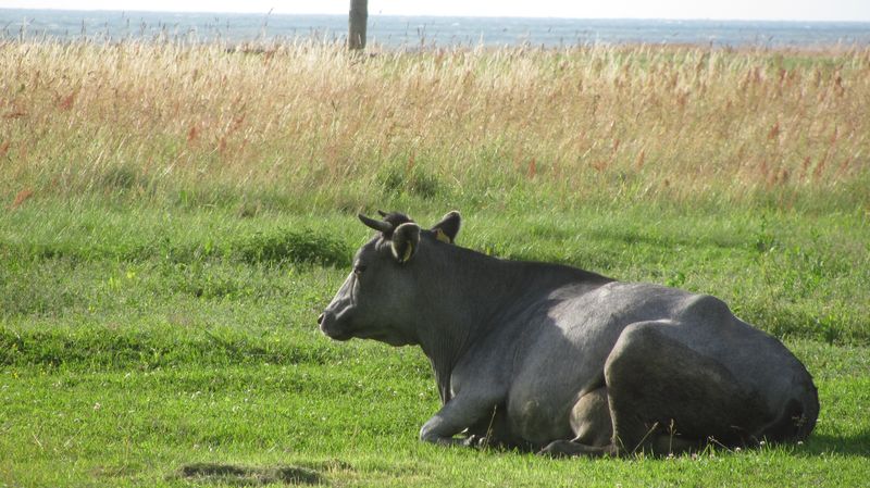 Berühmte Blaue Kühe. Hmmm, ich hatte sie mir blauer vorgestellt. Mit dem Bauern unterhalte ich mich in einem wilden Mix aus englisch, lettisch, russisch und deutsch.