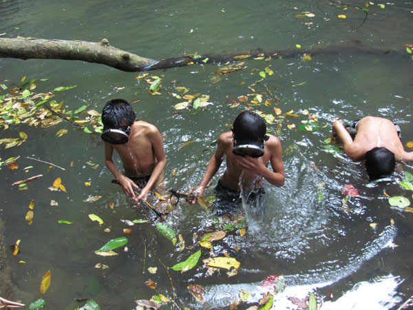 Irgendwann kommen wir an einen Wasserfall, bzw. einen Fluß der sich über duzende kleiner Wasserfälle über mehrere Hundert Meter erstreckt und von uns erklettert wird. An einem der zahlreichen Becken treffen wir drei Jungs, die mit selbstgebauten Harpunen und Tauchermasken fischen. Die Ausbeute kann man guten Gewissens als mikrig bezeichnen, doch sie wird direkt auf dem Lagerfeuer gegrillt und mit Lust verspeist − nichts schmeckt so gut wie selbstgefangenes. Aber für die Jungs steht eindeutig der Spaß an erster Stelle, und den haben sie mit uns jetzt noch mehr.