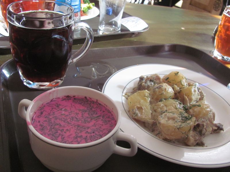 Hmmm, lecker Schlemmerei im Lido: Kvass, kalte Rote Beete Suppe und Kartoffel-Pilz-Auflauf.