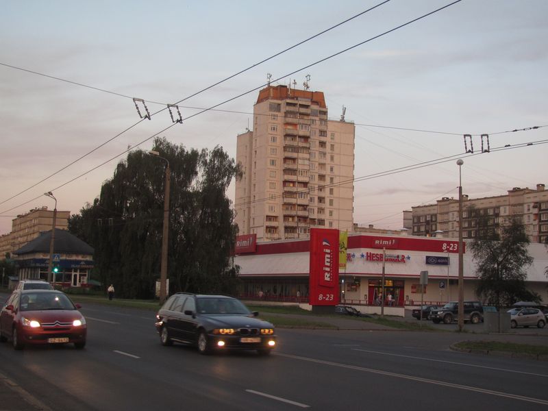 Plattenbau im Sonnenuntergang mit Rimi im Vordergrund.
