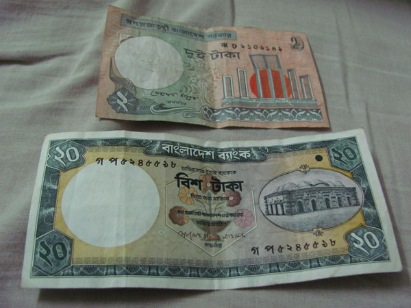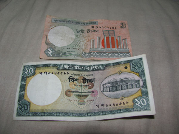 Abgesehen von den Hartals bin ich von Bangladesh absolut begeistert. Die Leute freuen sich ehrlich, mich zu sehen, sind extrem hilfsbereit (ohne, daß eine Gegenleistung oder ein Hintergedanke dabei eine Rolle spielt), das Essen ist extrem lecker und der 20 und 2 Taka Note verleihe ich hiermit den Preis „Die Schönsten Geldscheine die ich jeh gesehen habe“.